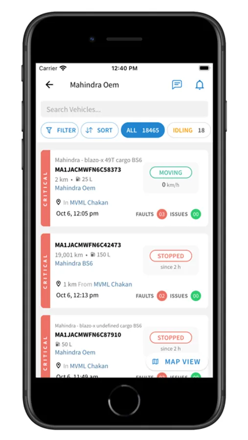 • Map View with Live Location along with Vehicle Speed and positioning details