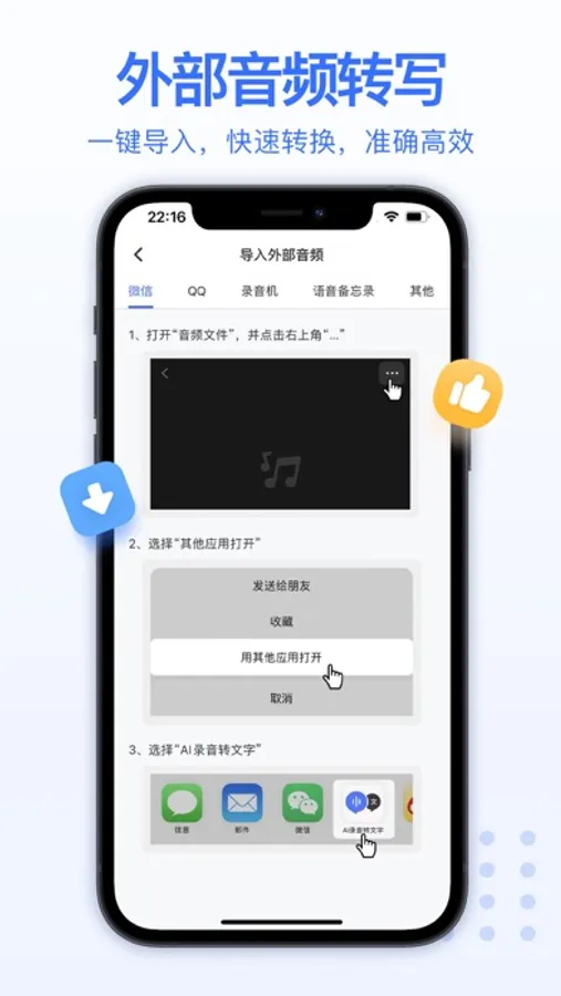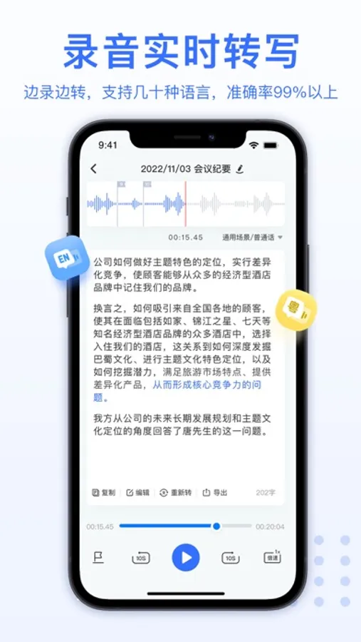 AI录音转文字,是在二十年智能语音识别研发成果的基础上,开发出的一款专业音频转文字、实时录音转文字、视频转文字、录音机、视频提取音频等多功能应用软件。产品依托专业AI智能识别系统,可快速的将录音、音频内容准确转换为文字。可满足超长时间的会议录音,采访记录,课堂录音,课程录音等场景的录音及转文字需求,全面提升办公效率。