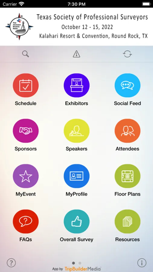 This TripBuilder EventMobile app is provided at no charge by the Texas Society of Professional Surveyors (TSPS). It was designed and developed by TripBuilder Media Inc. If you have any questions, or need any support regarding how to use this app, please submit a Support Ticket (located within the Help icon in the app).