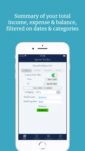 - After you apply a date filter and/or a category filter, you can check the filtered transactions by clicking on the Total Income and Total Expense buttons on the Home screen.