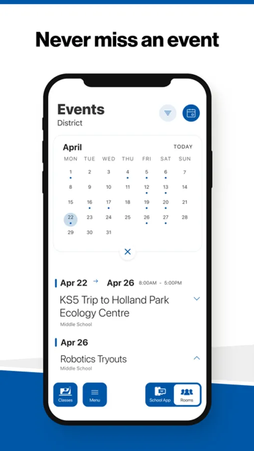 The event section shows a list of events throughout the district. Users can add an event to their calendar to share the event with friends and family with one tap.