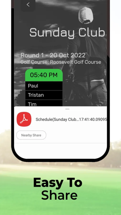 - Share the golf schedule via email, social, or messaging apps (comes in PDF format)