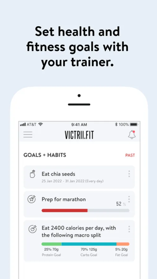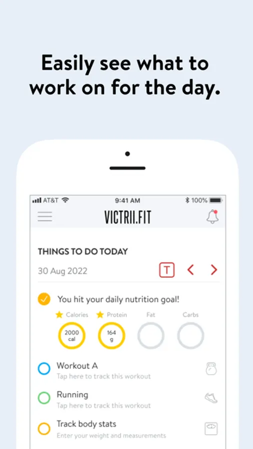 With the VICTRII FIT App, you will have access to workout programs designed specifically to help you reach your fitness and health goals! You can follow & track your workouts, your nutrition, your lifestyle habits, measurements and results–all with the help of your coach.