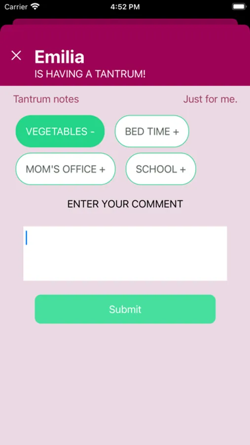 -One-tap tantrum tracking: The Tantrum button is easy to find and ready to be tapped at any time.