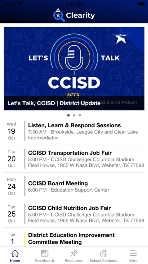 The CCISD Clearity app provides Clear Creek Independent School District employees with all the information they need in one place, conveniently accessed and formatted specifically for consumption on their mobile devices.