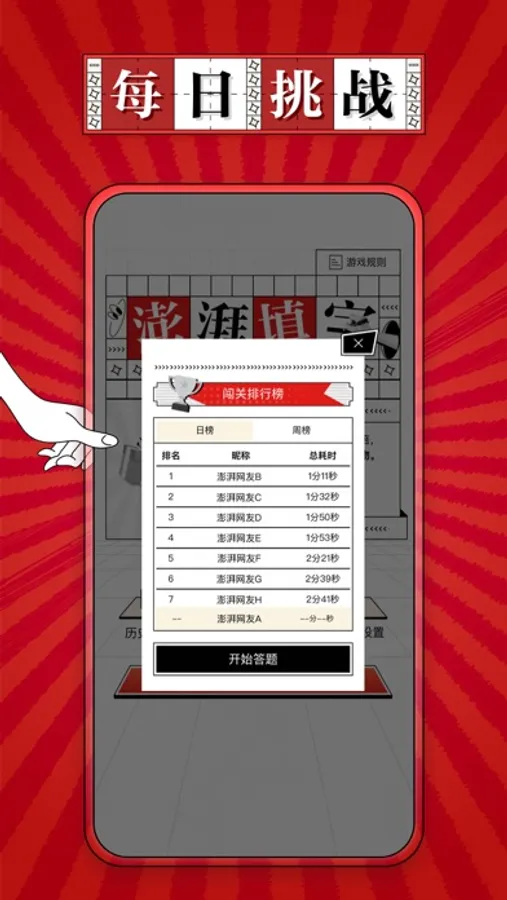 「澎湃填字」设有答题排行榜,每日/周实时更新,快来与广大填字爱好者们一较高下!