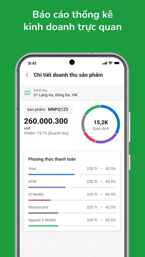 Thống kê và báo cáo doanh thu theo từng chi nhánh, dịch vụ; báo cáo các giao dịch thành công và thất bại theo thời gian thực, giúp Merchant nắm được số liệu thực tế về hiệu quả kinh doanh.