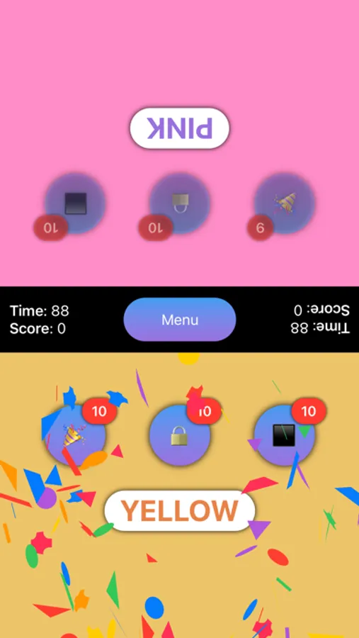 Crazy Color Clash - the game with 2 players, 1 device, 12 powerups, and 90 seconds. Play in one of 3 incredibly colorful game modes, clash with a friend or fly solo in practice mode. Use powerups to confuse and disorient your opponent and come out the victor once the time runs out.
