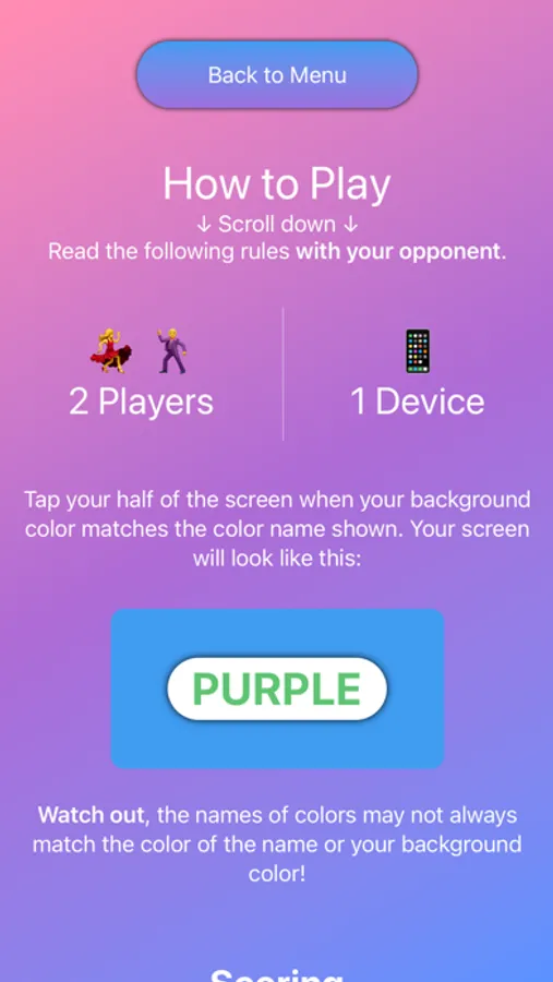 Tap your half of the screen when your background color matches the color name shown. Watch out, the names of colors may not always match the color of the name or your background color! Points are gained for matching color names to background colors, points lost for incorrect taps, and points forfeit for missed taps. There are 12 powerups that are granted throughout the game for correct taps. Mix and match to find the best combination against your opponent or skip powerups completely and stick to colors alone. Winner has the most points when time runs out. Do you have what it takes to win, or will you tap out?