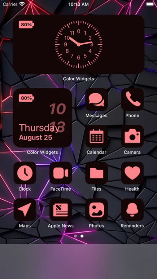With icon packs you can customize your app icons to further express yourself. Replace your default app icons with custom themed icons for all of your favorite apps. Explore dozens of different icon themes like Minimal, Galaxy, Cotton Candy, Navy, Christmas Wreath, and dozens more. Set entire icon packs in seconds with Color Widget’s quick install, or save the icons to your camera roll to use in the Shortcuts app.