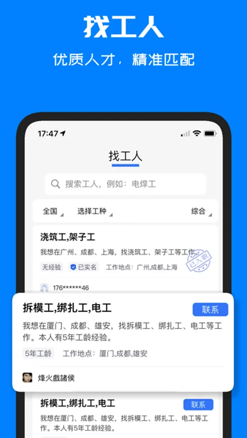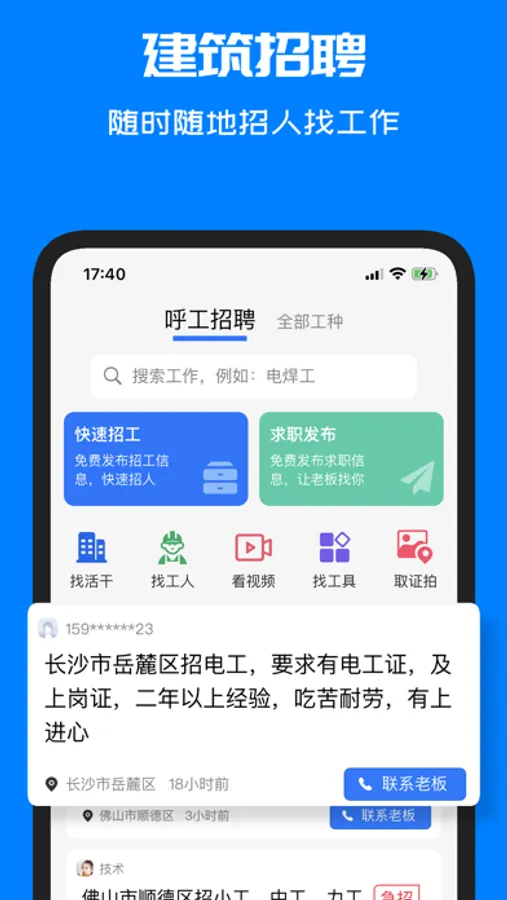 呼工招聘专注互联网建筑招聘求职找工作APP,求职者与招聘者精准匹配,快速找到好工作招到熟手工人。随时随地直接找活!职位多,入职快。