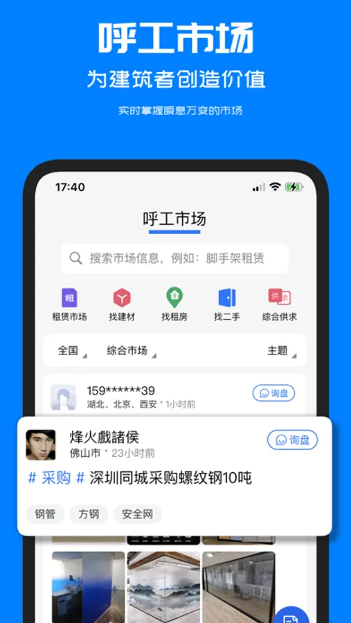 【市场】免费发求购、供应、租房等信息,让建筑人随时随地发现商机。