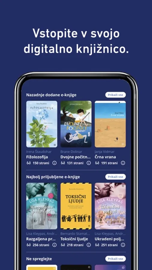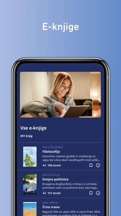 Med e-knjigami priznanih domačih in tujih avtorjev boste hitro našli svojo izbranko. V aplikaciji vas čakajo tako priljubljeni naslovi, kritično odmevne knjige, kriminalke ali ljubezenske zgodbe. Raziskujete lahko poezijo ali prozo. Pravljice ali basni. Vsak mesec bomo dodali nove vsebine, tako da boste vedno lahko odkrivali še več.