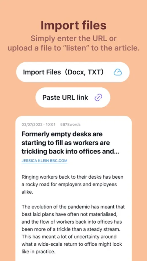 - Import files: Simply enter the URL or upload a file to "listen" to the article.