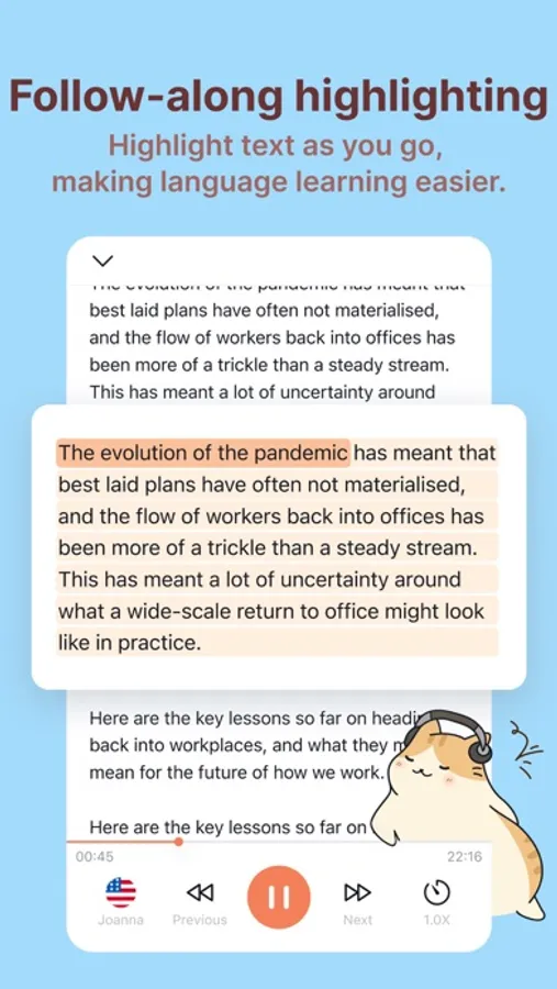 - Follow-along highlighting: Highlight text as you go, making language learning easier.
