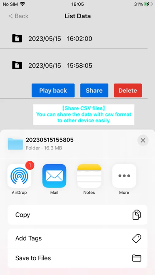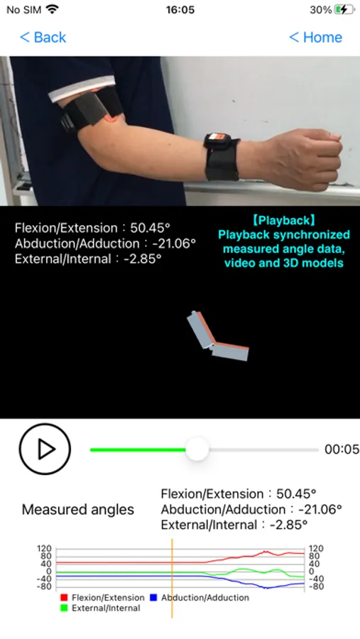 Since it is a digital goniometer application between two segments, when applied to the human body, the relative angle between the parts where the sensor is attached can be obtained as 3-axis data. Sensor data can be monitored in real-time while being recorded on an iPad. In addition, by enabling video recording with the device’s video camera, it is possible to synchronize sensor data and video and play back after measurement. In addition, the resulting data can be output externally as CSV.
