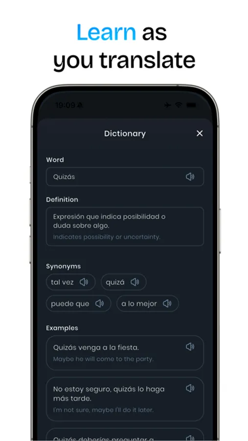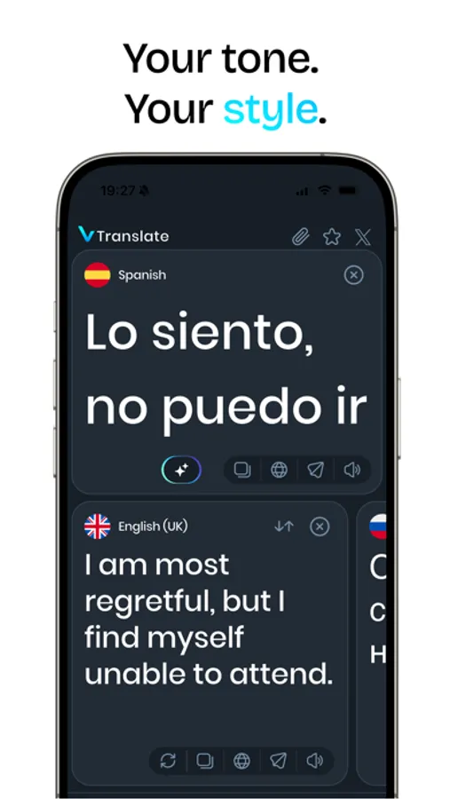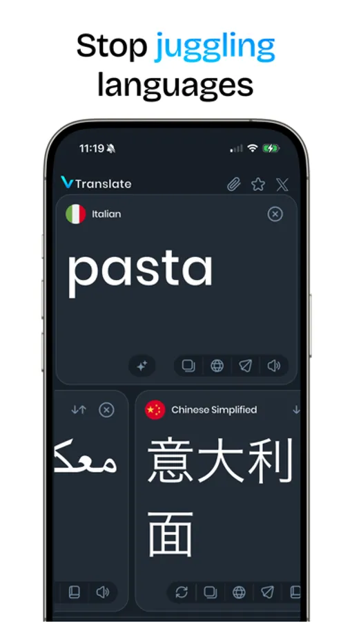 No more switching between language pairs. Translate once, see all your languages instantly. Compare nuances, share with different people, think in multiple languages—all on one app.
