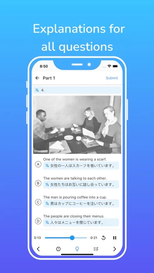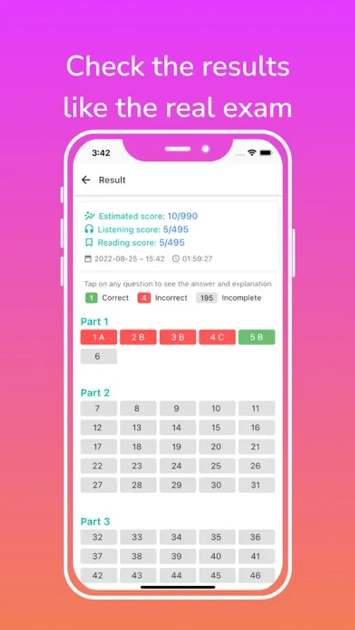 - Each practice includes questions according to listening or reading skills, randomly selected to familiarize users with different types of questions.