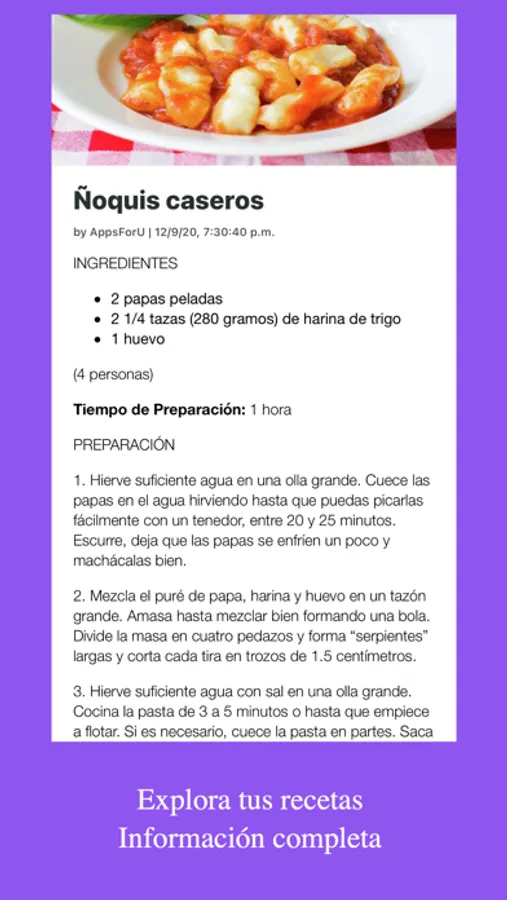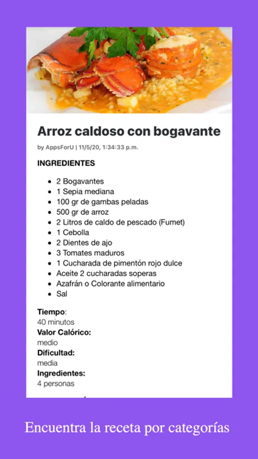 - Recetas con su tiempo de preparación, porciones, dificultad, ingredientes y pasos.