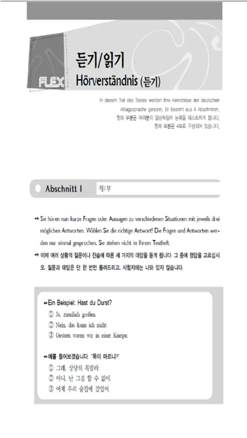 《FLEX 독일어》는 시험에서 고득점을 얻기 위한 지침서로서 FLEX 독일어 시험을 준비하는 분들에게 길잡이가 되도록 시험(듣기, 읽기, 말하기, 쓰기) 안내, 시험 유형 분석과 해설 그리고 실전 문제 등으로 엮었다.