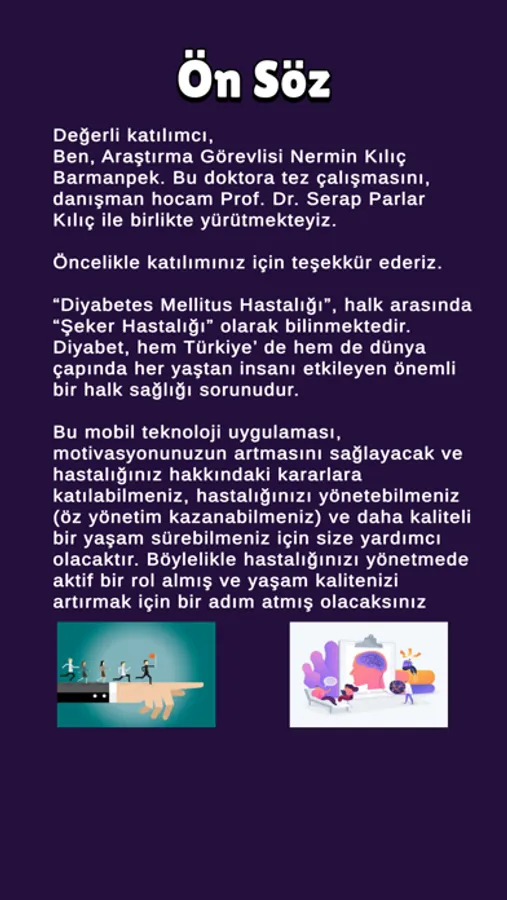 Bu uygulamada, diyabetik hastaların kendi hastalığını ne kadar tanıdığına ve tedavisi konusunda ne kadar bilgi sahibi olduklarını anlamaları amacıyla oluşturulmuş oyun tarzı bir bilgilendirme ve bilinçlendirme uygulamasıdır.