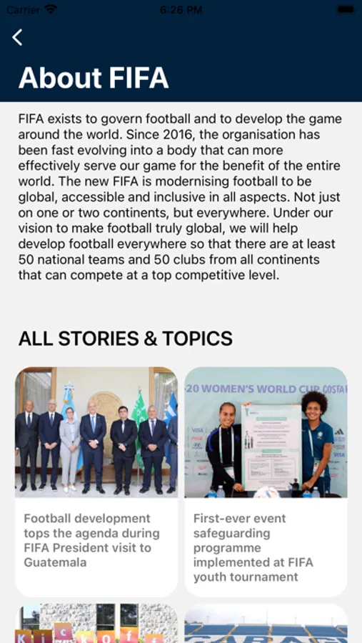 FIFA exists to govern football and to develop the game around the world. The new FIFA is modernising football to be global, accessible and inclusive in all aspects. Not just on one or two continents, but everywhere. Under our vision to make football truly global, we will help develop football everywhere so that there are at least 50 national teams and 50 clubs from all continents that can compete at a top competitive level.