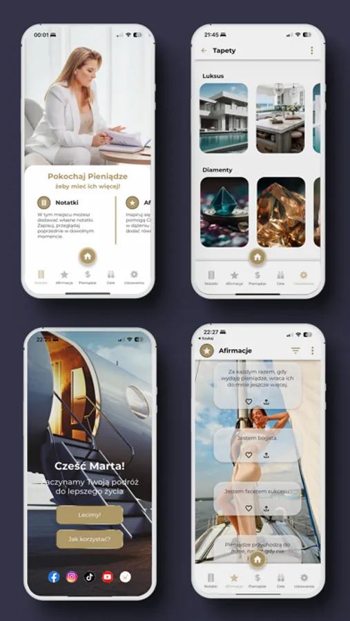 Znajdziesz tu bardzo dużo pozytywnych afirmacji na temat pieniędzy. Możesz również dodawać własne, oznaczać jako ulubione, a także dzielić się nimi ze znajomymi. Codziennie otrzymujesz powiadomienia z afirmacjami na dany dzień. Możesz wybrać do 10-ciu powiadomień dziennie! To ty decydujesz o ich częstotliwości i sam ustalasz godzinę. Wybierz, czy chcesz otrzymywać afirmacje dla kobiet, mężczyzn, czy wszystkie.