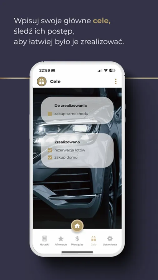 Pamiętaj, że jasno określone cele są bardzo ważne w życiu. W tej sekcji wpisuj swoje główne cele i te mniejsze, które doprowadzą Cię do jego osiągnięcia. Śledź ich postęp, aby łatwiej było je zrealizować. Marzy Ci się wyjazd na Bali? Co musisz zrobić, aby tego dokonać? Każdy zrealizowany cel możesz z czasem oznaczyć jako osiągnięty.