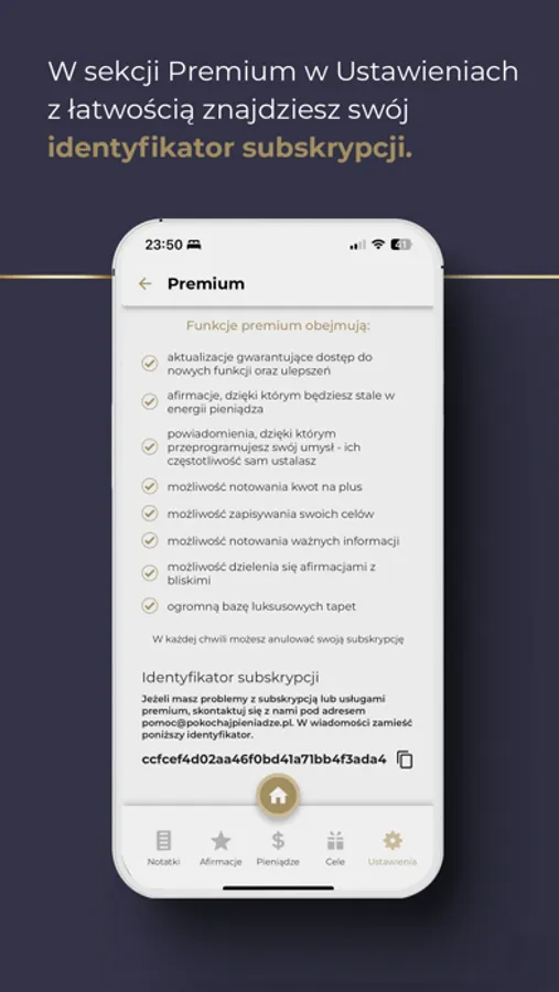 Z łatwością znajdziesz identyfikator Twojej subskrypcji premium jeśli będziesz chciał skontaktować się z nami i uzyskać informacje na temat Twojego zakupu. Znajdziesz go w ustawieniach, na samym dole w sekcji Premium.