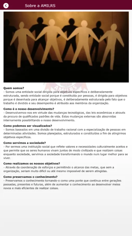 - Através do botão "Sobre a AMILRS" o usuário terá acesso a informações sobre a história e sobre os princípios da AMILRS.