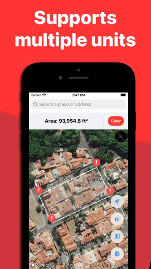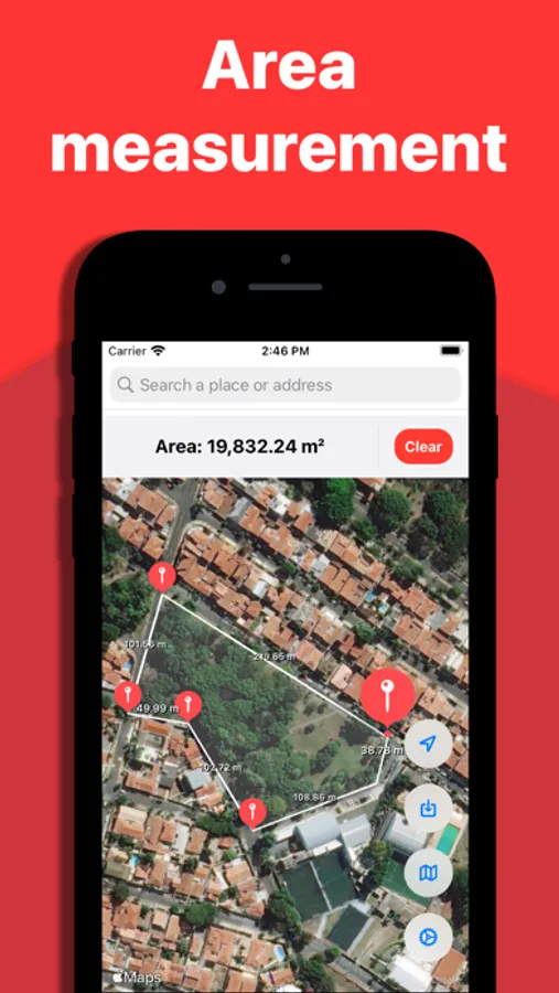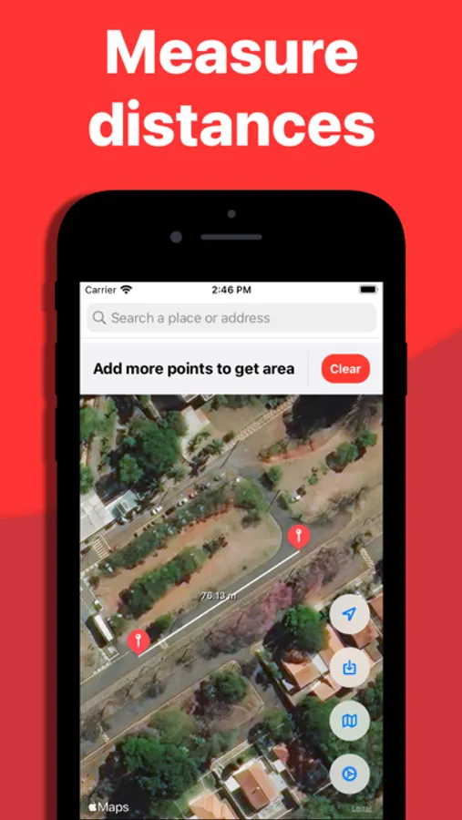 Just tap the map to add a marker. Continue adding markers to see the distance between them and the area that is enclosed by them