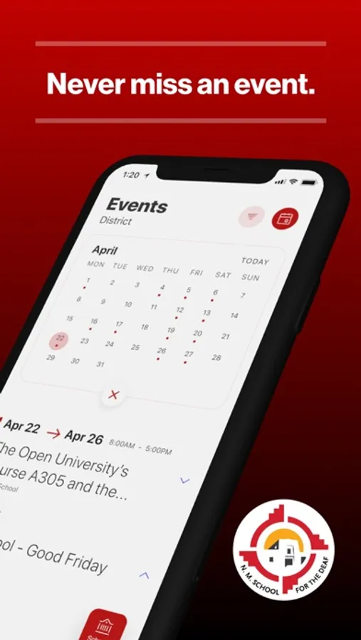 The event section shows a list of events throughout the school. Users can add an event to their calendar to share the event with friends and family with one tap.
