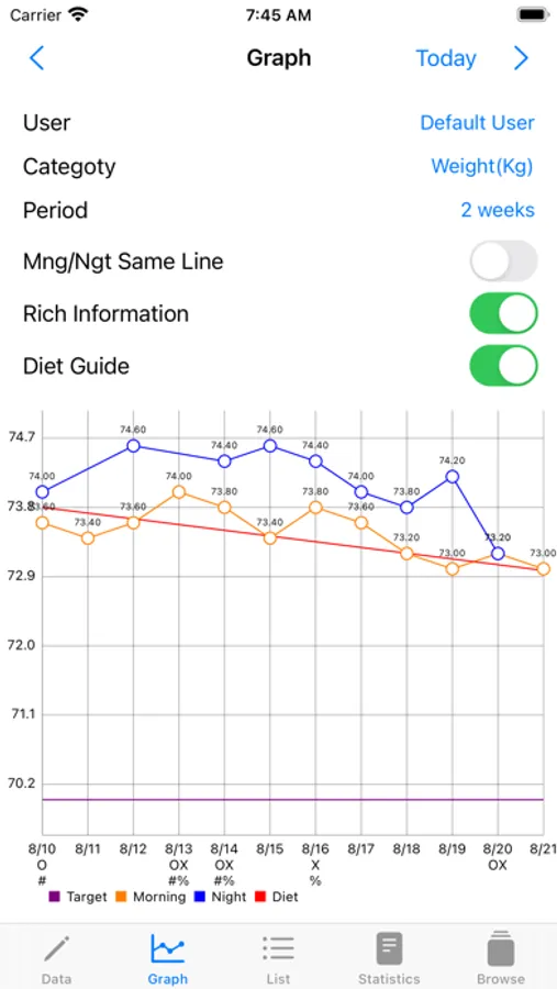 For statistical information, you can also get the average of standard weight, weight difference to the target weight, 1 week, 2 weeks, 1 month, 2 months, 3 months, 6 months.