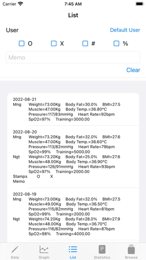 In the Health Log, the current weight, muscle mass, body temperature, blood pressure, oxygen concentration, exercise amount, steps, etc. are visualized in a list display and a graph display.