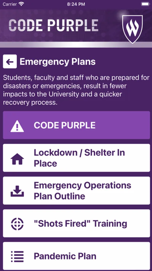 Code Purple is the official safety app of Weber State University. It is the only app that integrates with Weber State University's safety and security systems. The app will send you important safety alerts and provide instant access to campus safety resources.