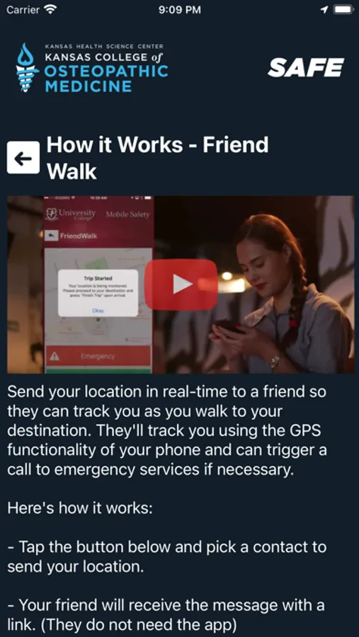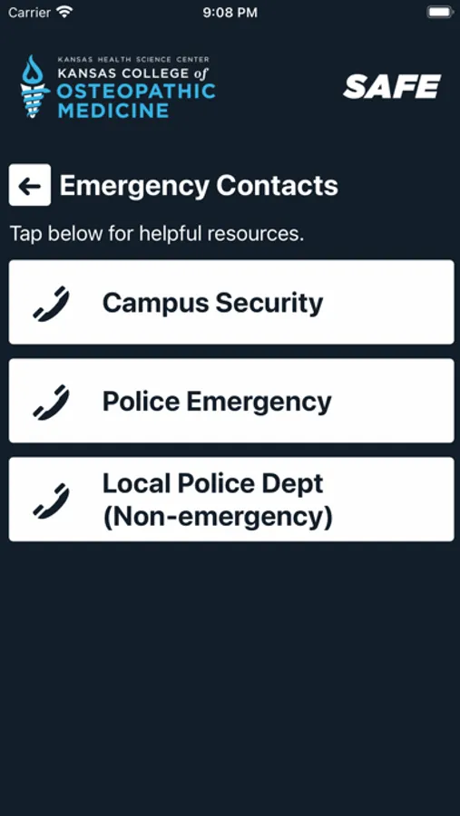 - Safety Notifications: Receive instant notifications and instructions from Kansas College of Osteopathic Medicine safety when on-campus emergencies occur.