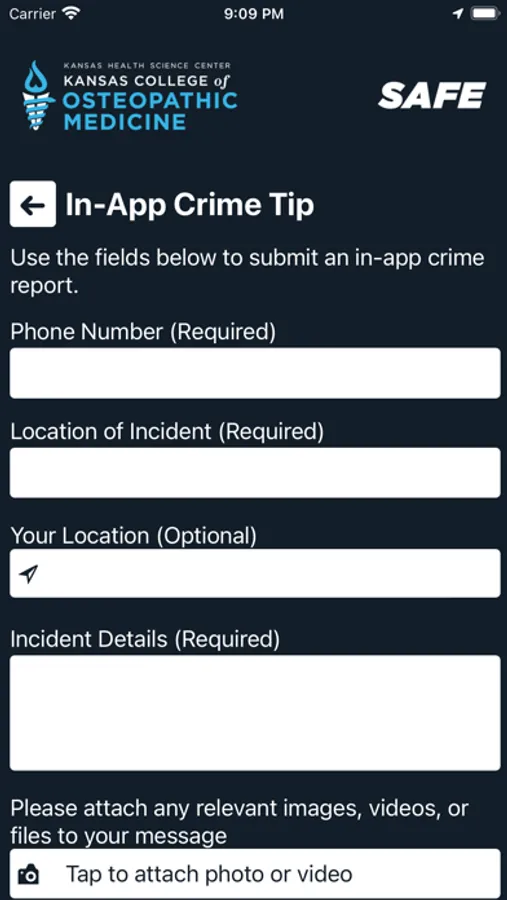 - Tip Reporting: Multiple ways to report a safety/security concern directly to Kansas College of Osteopathic Medicine security.