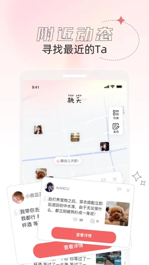 桃夭是一款为拉近附近,同城距离的APP,同一个城市,成为朋友的概率是极小极小。在这每一次动态/兴趣的分享,都有志同道合的人相遇。