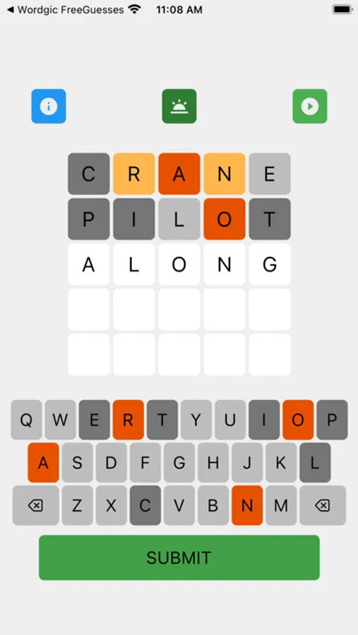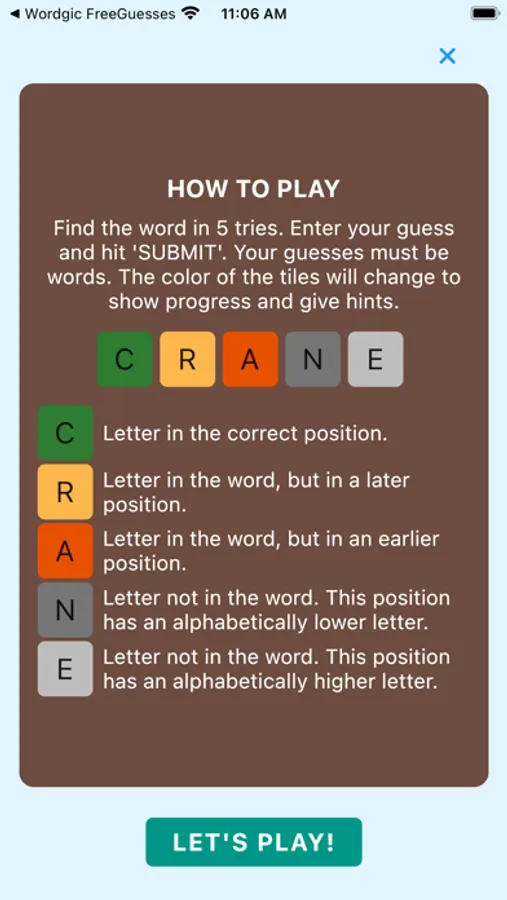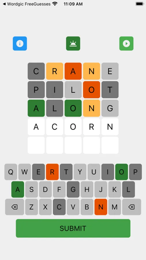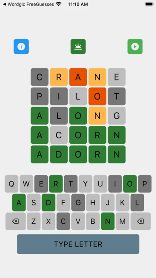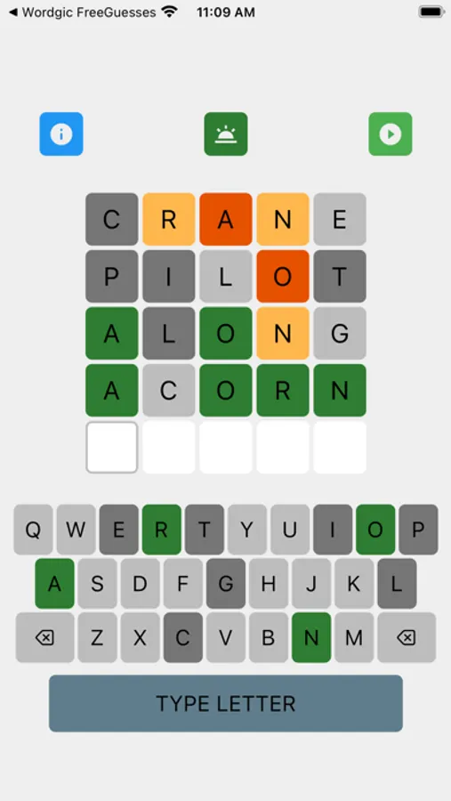'Wordgic - Word Only Guesses' is a word finding game where players search for the word in five tries. All of the guesses must be words. After each try, the color of the letters will change to show progress and give hints: