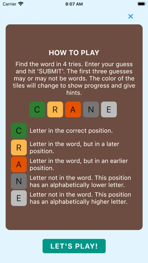 'Wordgic - Find Word in 4 Tries' is a word finding game where players search for the word in four tries. The first three guesses may or may not be words. After each try, the color of the letters will change to show progress and give hints: