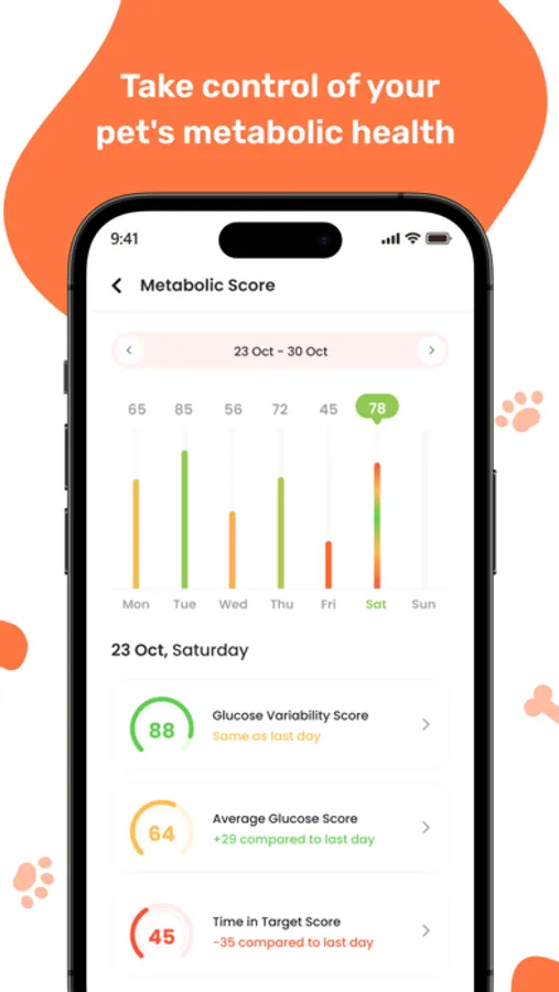 A perfect combination of CGM (Continuous Glucose Monitoring Sensor), Live Glucose Level, Metabolic Health data, and Meal Score insights of pet.