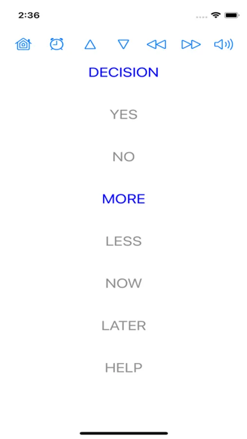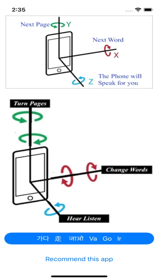 To change categories you should turn your phone to the right and back, to switch between the list of words turn your phone forward and back, to pronounce the word rotate slightly counterclockwise and back; You only need to hold your phone with one hand and make a movement to communicate. Seven essential categories with seven essential words each.