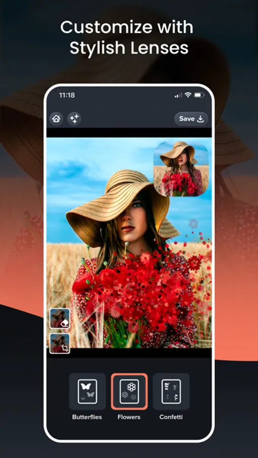 Lens options: Many effects offer a variety of lenses to change the motion graphics on your photo. Lens options include hearts, bubbles, feathers, butterflies, stars and many others (even smiley faces).