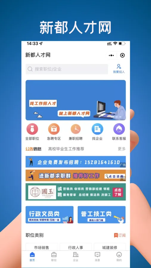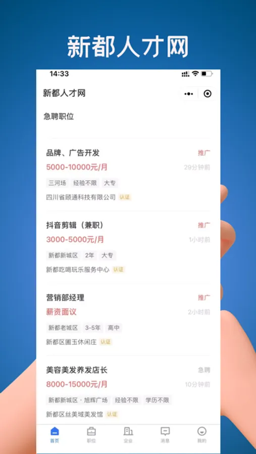 新都找工作、新都招人才,就上新都人才网! 新都人才网致力于为求职者提供新都本地优质招聘信息、为企业提供专业人才招聘渠道,帮助每一个求职者在新都找到合适的工作!找新都好工作,招新都好人才,就上新都人才网,本地平台更靠谱!
