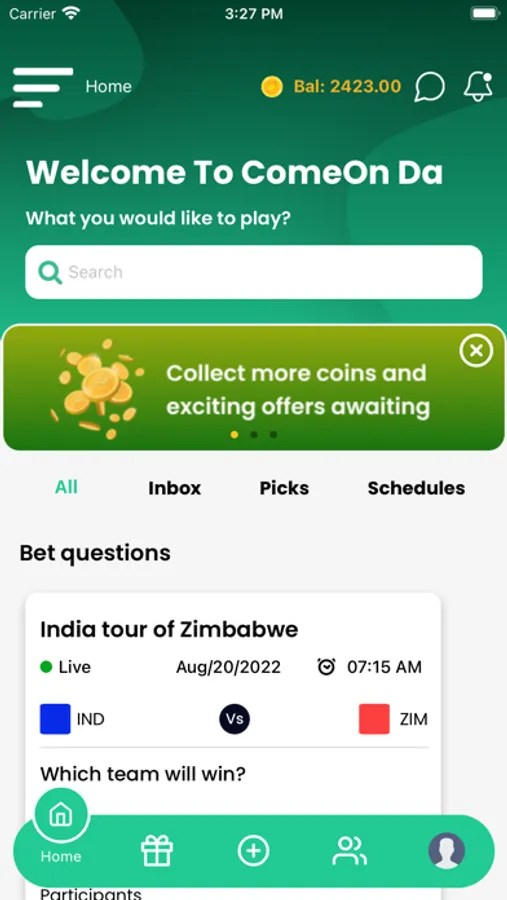 ComeOnDa (COD) is a fun app which lets you challenge your friends and family. It is a social prediction game for sports, and general topics and events. COD is a great way to stay connected and engage with your peers using the fun element of gambling. The app connects the users to small retail businesses thereby allowing the business owners to promote their business/ store with a wide outreach. The word 'Da' in the app name is derived from South Indian language which translates to "buddy/ mate". It is a common term used in the southern states of India to both challenge and encourage your peers. So without further ado, download COD and dare your peers saying 'ComeOnDa'.