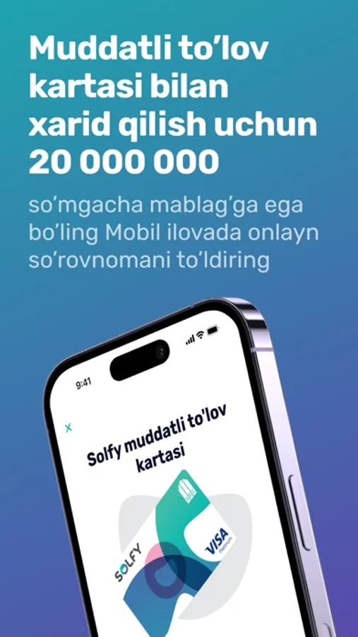 Solfy muddatli to’lov kartasi yordamida muddatli to’lov shartlari bilan hamkorlarning keng tarmoqli do’konlaridan: oziq-ovqat mahsulotlaridan tortib qurilish materiallarigacha, texnikadan kiyim-kechak va poyabzallargacha, restoranda ovqatlanishdan tortib ta’til harajatlarigacha istagan narsangizni xarid qilishingiz mumkin.