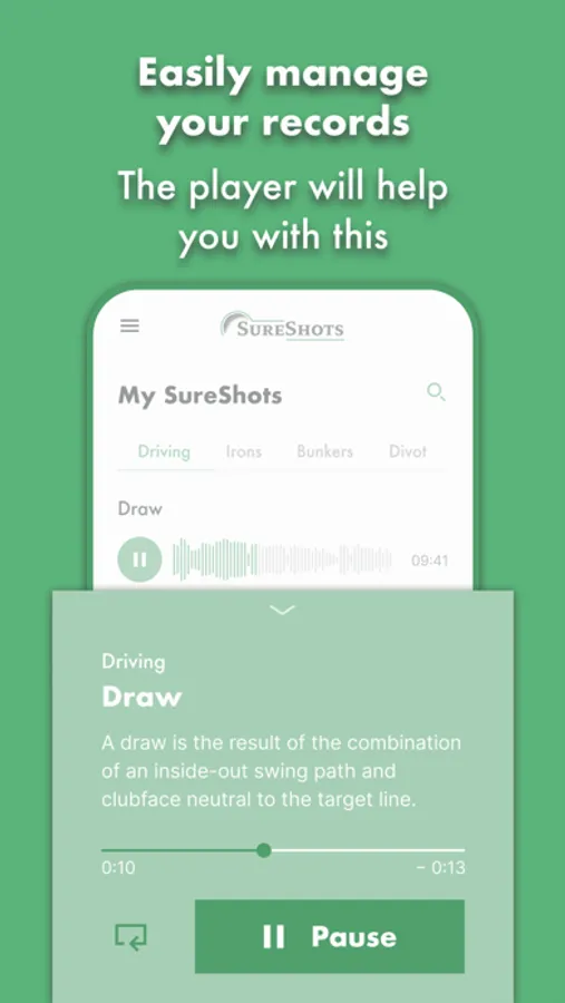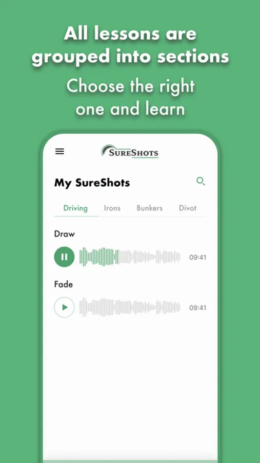 SureShots™ are short audio tips (less than 30 seconds) that walk you through how to hit every golf shot, exactly when you need to hit it. If you’ve got your clubs and a SureShots™ Membership, you have everything you need to hit every golf shot.