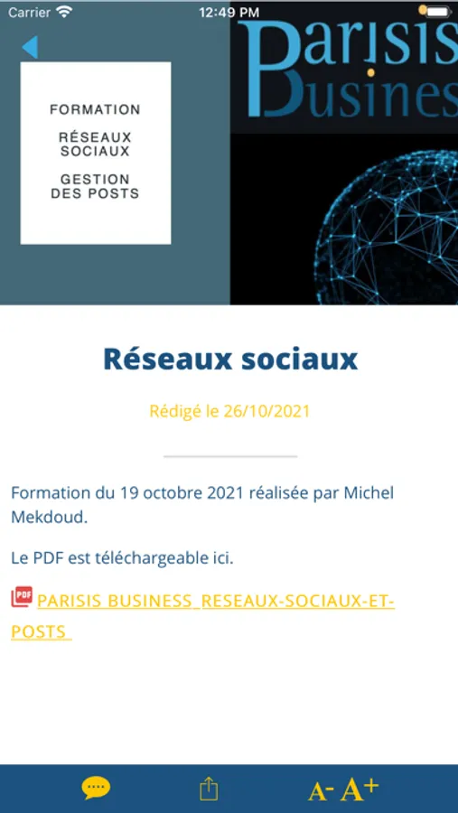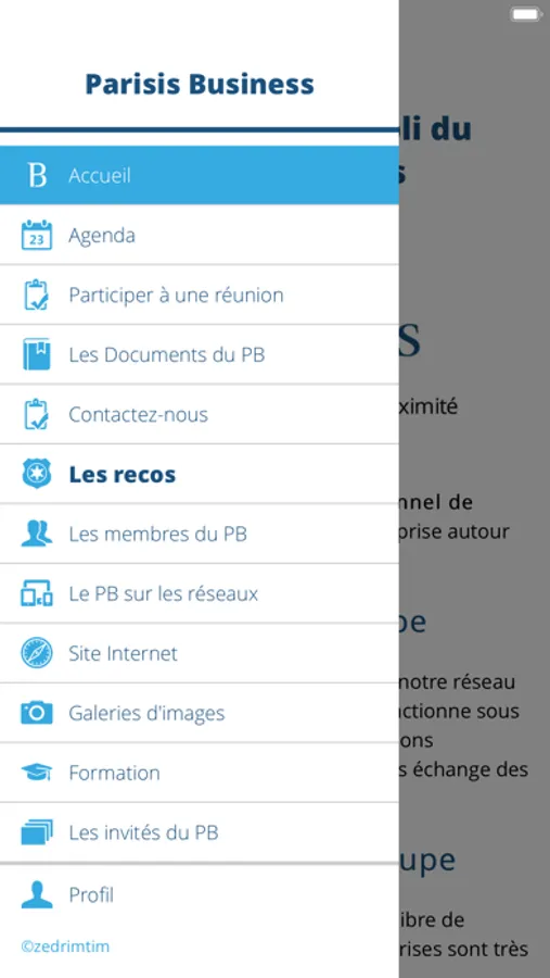 Vous y trouverez : • l'agenda du Parisis Business • accéder à un formulaire pour participer à une réunion • les informations diffusées sur les réseaux sociaux de l'association (Facebook, Instagram, Linkedin, Youtube...) • les informations sur les adhérents de l'association • les reportages photos des évènements