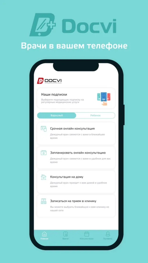 DocVi - это мобильное приложение, которое поможет вам в режиме онлайн записаться на консультацию к специалисту, проконсультироваться с ним, а также вызвать на дом.