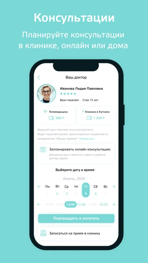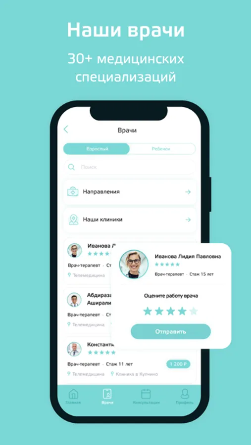 В мобильном приложении предусмотрено два вида онлайн консультаций. 1) Срочная онлайн консультация, на которой врач (терапевт и педиатр) ответит вам в течение 15-30 минут. 2) Запланированная консультация, на которой вы сможете встретиться в режиме онлайн с узкопрофильными специалистами с 9:00 до 21:00.